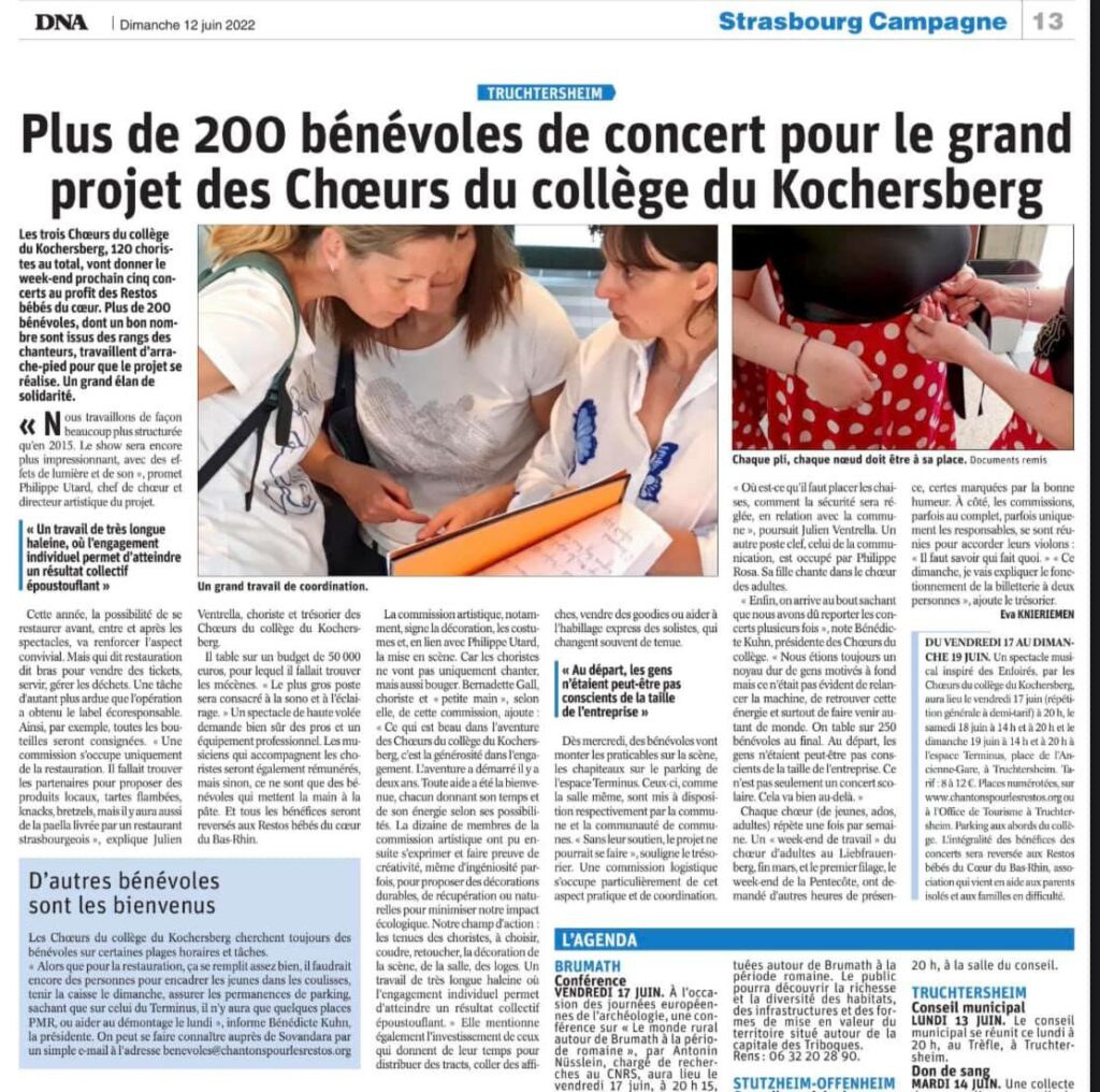A l’invitation de Jean-Jacques Goldman en janvier 2014, trente jeunes choristes ont vécu une aventure exceptionnelle aux côtés des Enfoirés sur la scène du Zénith de Strasbourg. Ils ont prolongé cette parenthèse en avril 2015 avec l’ensemble des choristes en donnant quatre concerts à la manière des Enfoirés : chansons françaises et internationales, medleys rassemblés en tableaux, une partie théâtrale, chorégraphique, accompagnés de musiciens. L’intégralité des bénéfices de ces concerts a été versée aux Restos du Cœur du Bas-Rhin, soit la somme de 20 000,00 €. Ils ont réitéré ce projet fou en juin 2022 avec l’aide de plus de 250 bénévoles et plus de 2000 personnes qui ont assisté aux trois jours de concerts. Grâce à l'opération « Chantons pour les Restos », ce fut plus de 25 000,00 € qui ont été remis aux Restos Bébé du Cœur du Bas-Rhin en juillet 2022.
